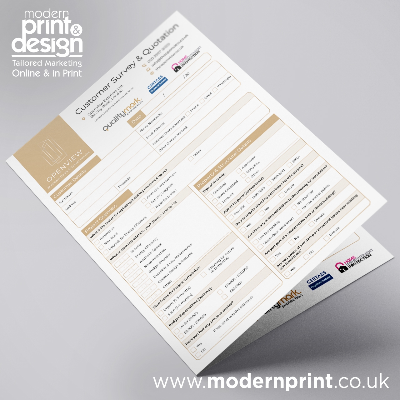 Open View Windows, Doors and Conservatories, a London-based company, needed professional customer survey and quotation forms. They turned to our expert survey form printers to create forms for them. Moreover, they needed them to be practical, visually appealing, and easy for staff to use every day.