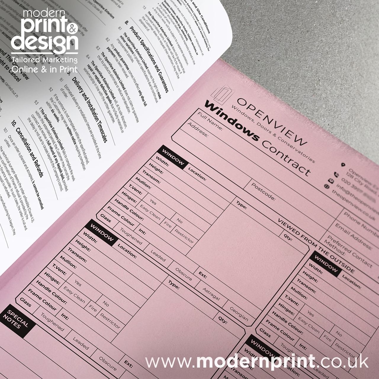 Following this success, Open View placed a follow-up order for A4 two-part carbonless window and also door contracts. These were created as durable books of 100 sets each. Meanwhile the printed front covers displayed the same design as the forms inside for instant recognition. Finally, the long, unprinted back covers acted as writing shields. These prevented the carbonless image from transferring to the next set, keeping the documents professional.