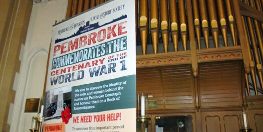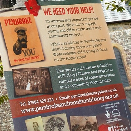 The first thing our roller banner designers did was hold a free design briefing with the Pembroke and Monkton Local History Society to find out exactly what they were looking for. At this meeting it was decided that whilst it needed to be modern the roller banners design must be in keeping with the style and themes used in design in 1918. For this reason a weathered block typeface was chosen for the the main heading because that was often the look of letter press printing in the early nineteen hundreds.